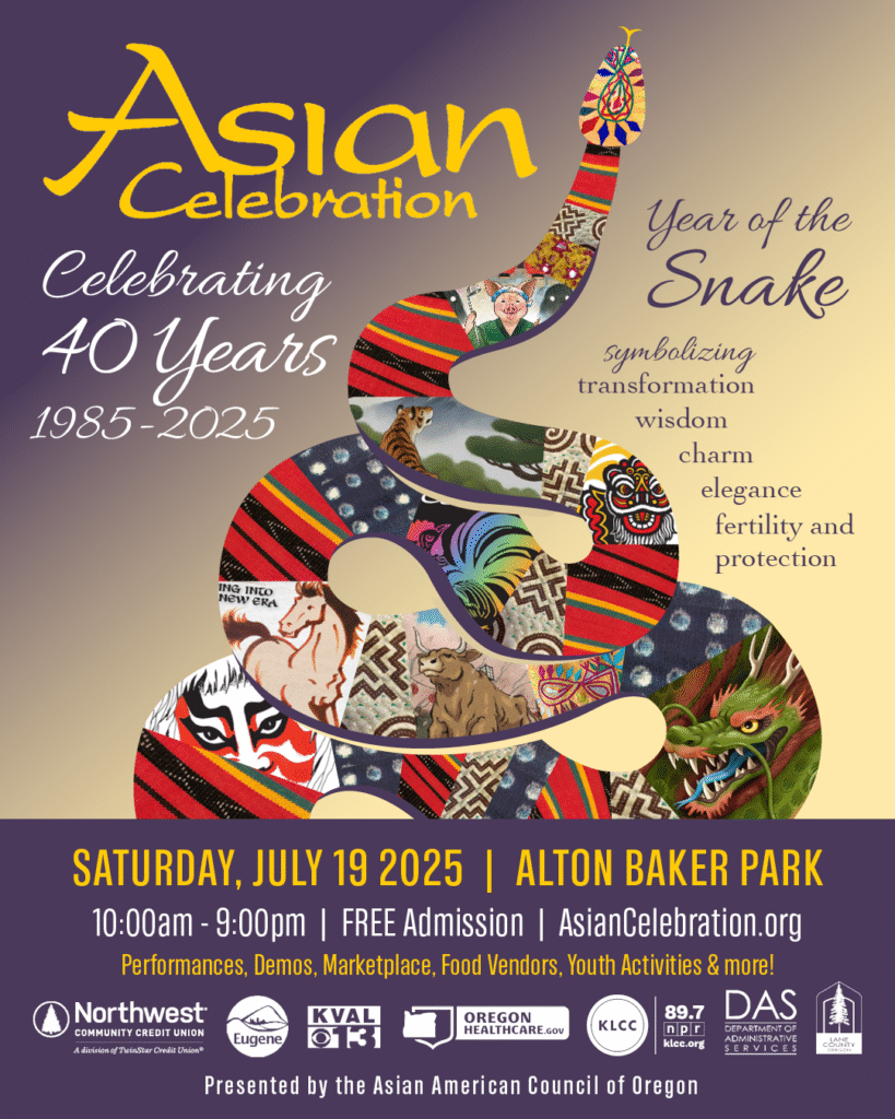 The Oregon Asian Celebration is produced by the Asian American Council of Oregon with support from Northwest Community Credit Union, Oregon Health Insurance Marketplace, City of Eugene, Lane County, State of Oregon, KVAL-TV, and KLCC.FM.