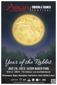 This year’s Heritage Exhibit features 40 consecutive years of posters created to promote the Oregon Asian Celebration. Over the festival’s history, these beautiful themed posters were designed by local artists who were involved with the festival in various ways. Among them were long-time volunteer Kenji Kobayashi, Chinese brush painting instructor and art show participant Kathy Hoy, anime artist Marianne Walker, illustrators Cindy Lee and Barbara Townsend, and taiko drummer Melody Howe.